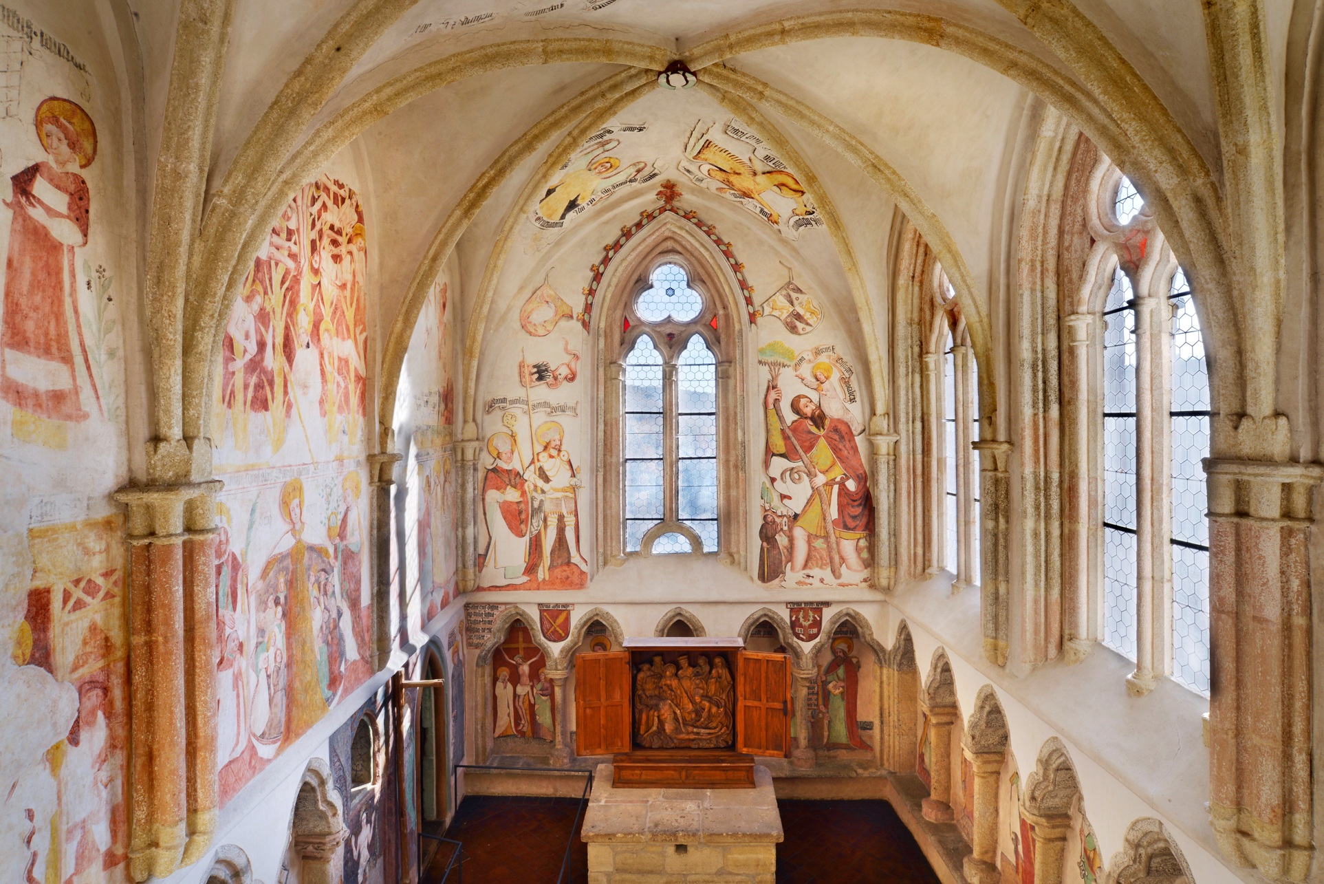 St. Wenceslas Chapel is one of the highlights of the works of the Písek Royal Builders. It is a fine example of early Czech Gothic and under Přemysl Otakar II, its completion ended the construction of the original Zvíkov castle. The Medieval style of the chapel is heightened by mural paintings dating from 1480-1500. panorama, legend